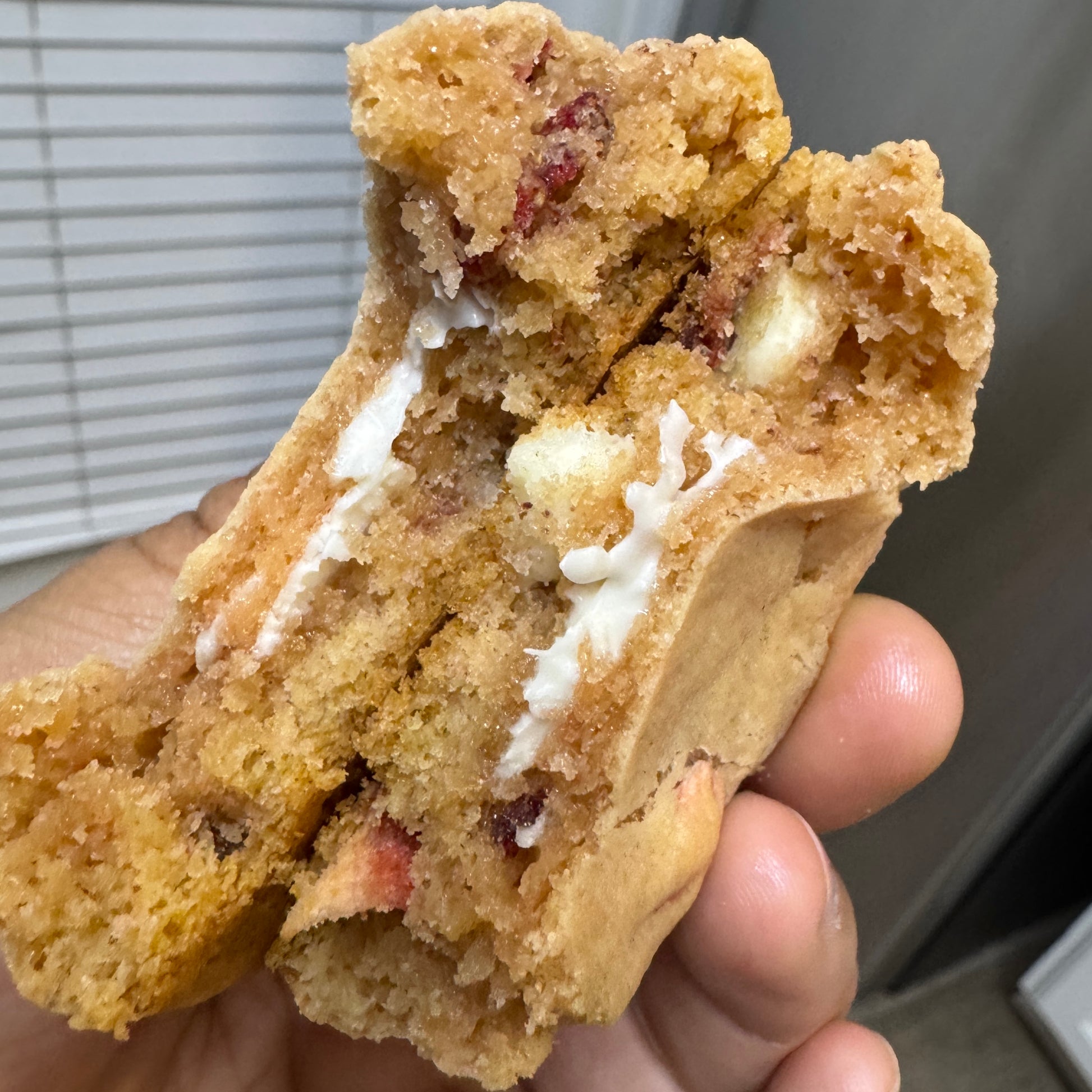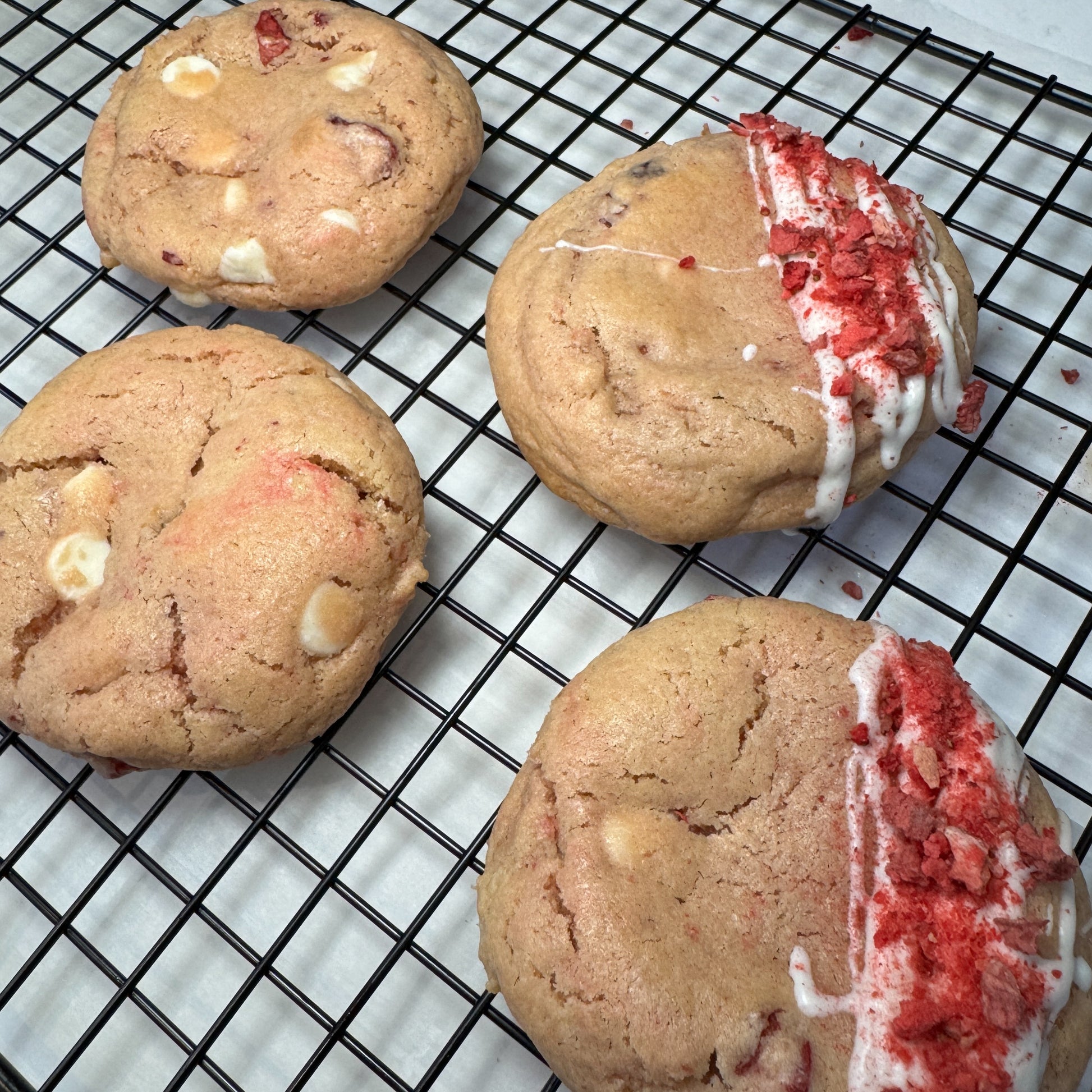 Flour | Eggs | Sugar | Brown sugar| White chocolate Chips | Freeze-dried strawberries | Vanilla Extract | Strawberry Extract